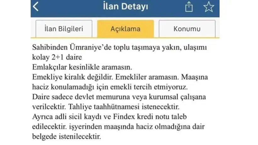 Ümraniye’de bulunan bir 2+1 kiralık dairenin ilanında, mülk sahibi tarafından “Emekliye kiralık değil. Emekliler aramasın” şeklinde ifadeler kullanıldığı fark edildi.