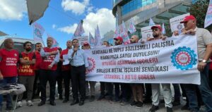 Hyundai Asansör’de örgütlü Birleşik Metal-İş Sendikası üyeleri, toplu sözleşme sürecine ilişkin taleplerini duyurmak amacıyla Kadıköy Yenisahra’daki Hyundai Elevator Genel Merkezi önünde basın açıklaması yaptı. Sendika, işverenin yıllar süren yargı sürecinin ardından kesinleşen yetkiye rağmen toplu sözleşme sürecinde uzlaşmaz bir tavır sergilediğini belirterek, “İşverenin dayattığı zam oranı değil, sıfır zamdır” açıklamasında bulundu.